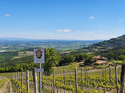 La dolce pendenza collinare permette una vista così ampia da scorgere dapprima gli antichi corpi di fabbrica settecenteschi con di fronte la cantina di architettura contemporanea, intravedere oltre i vigneti il piccolo lago riserva naturale circondato da prati e pioppi. Sulla sponda proprio sotto uno dei vigneti più belli insiste anche una tomba etrusca ancora mai scavata ma di cui si conosce l'esatto sito e le dimensioni. A destra, dopo un leggero saliscendi e il bosco di querce con la tartufaia naturale, l'antico uliveto. Insomma, uno scenario a tratti pastorale.